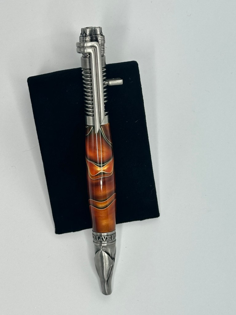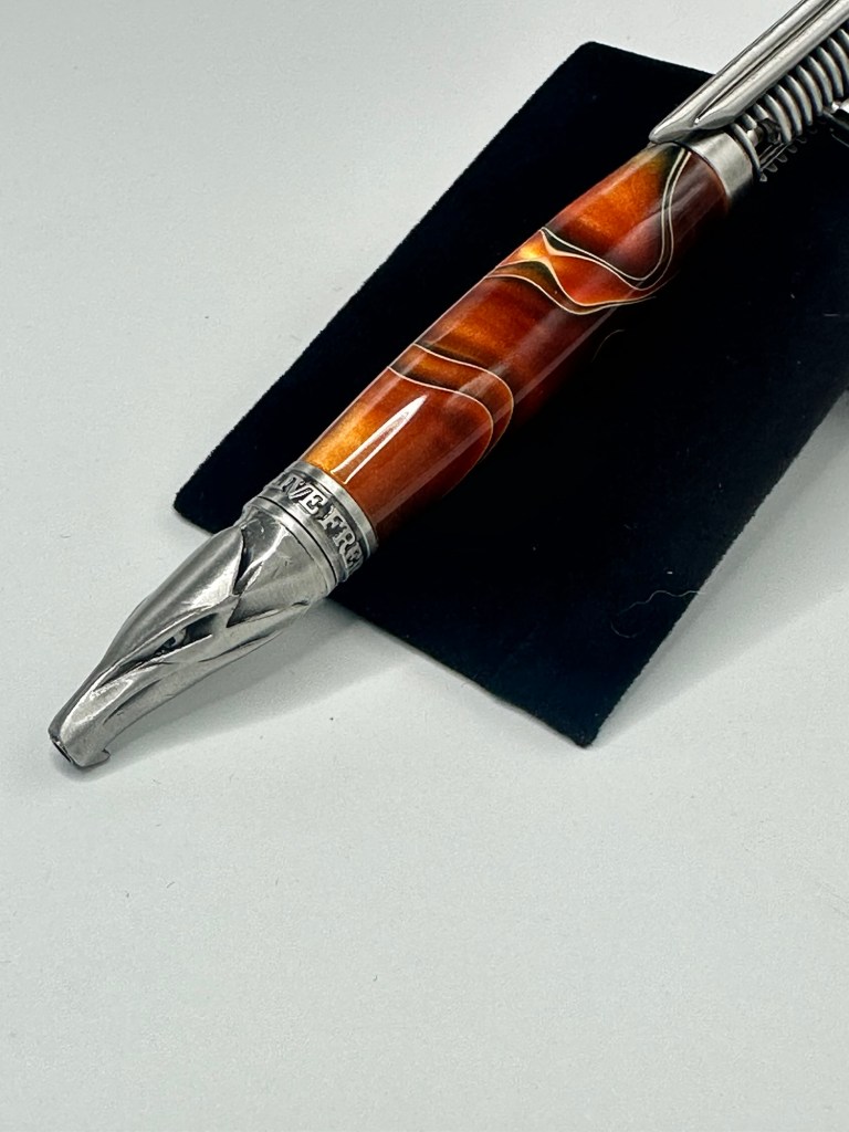 #27 Motorcycle Pen in Shiny Orange Risen with a Antique Pewter Finish